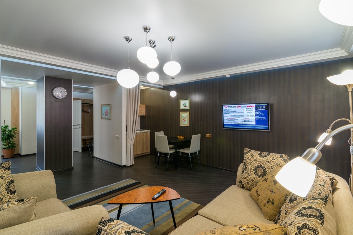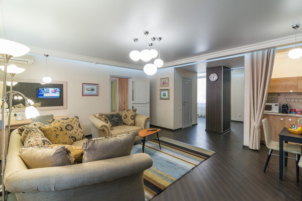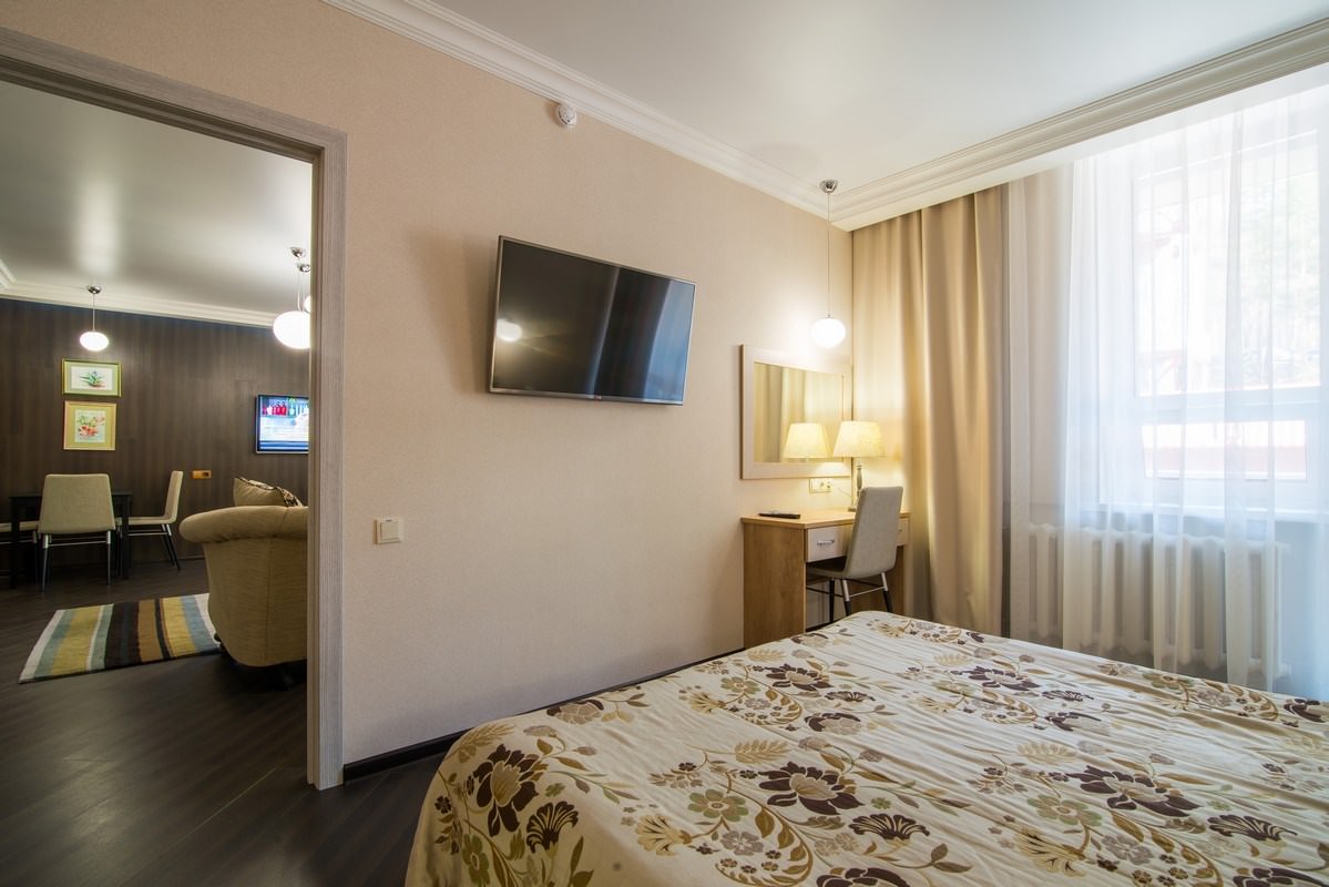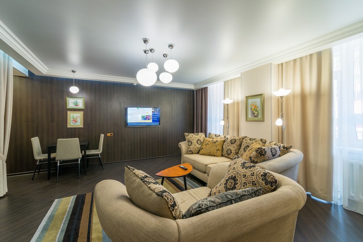 Трехкомнатный номер площадью 93 кв.м., состоящий из двух спален, просторной гостиной с кухонной зоной, комнаты отдыха, двух ванных комнат и гостевого санузла. В номере возможно комфортное размещение как одного-двух гостей, так и большой семьи. В санатории «Россия» дети до 4-х лет размещаются в номере бесплатно без предоставления дополнительного места. При желании для комфортного сна малыша в номере устанавливается детская кроватка (данная услуга бесплатна). Стоимость детского питания (для детей до 4-х лет) составляет 360 рублей в сутки.
