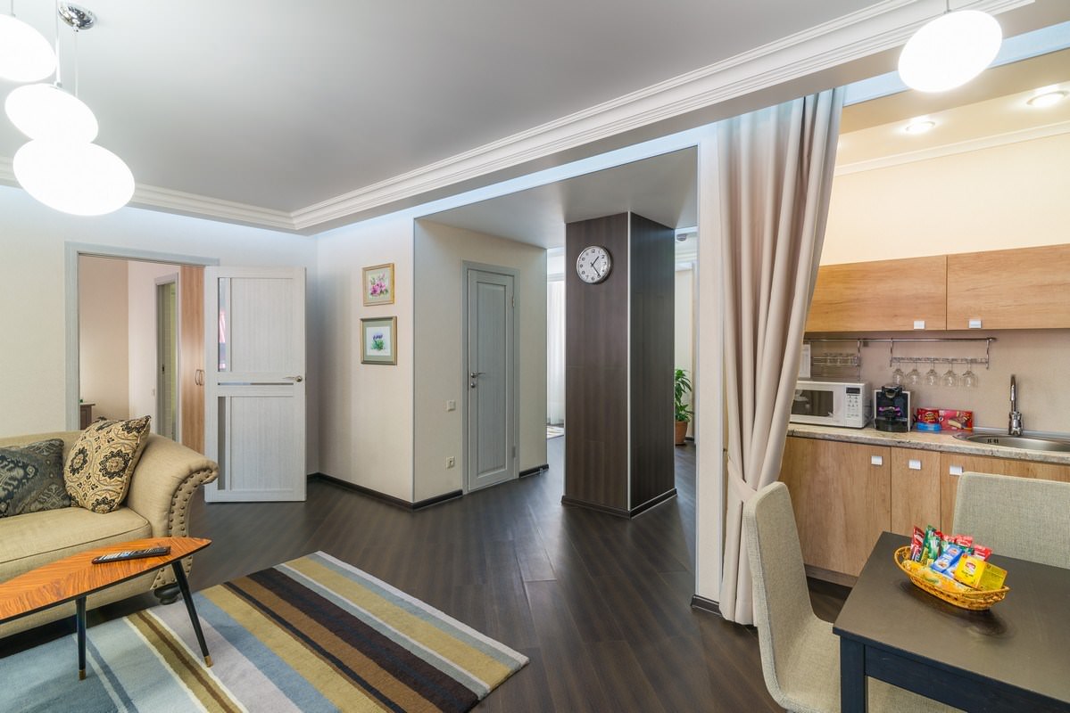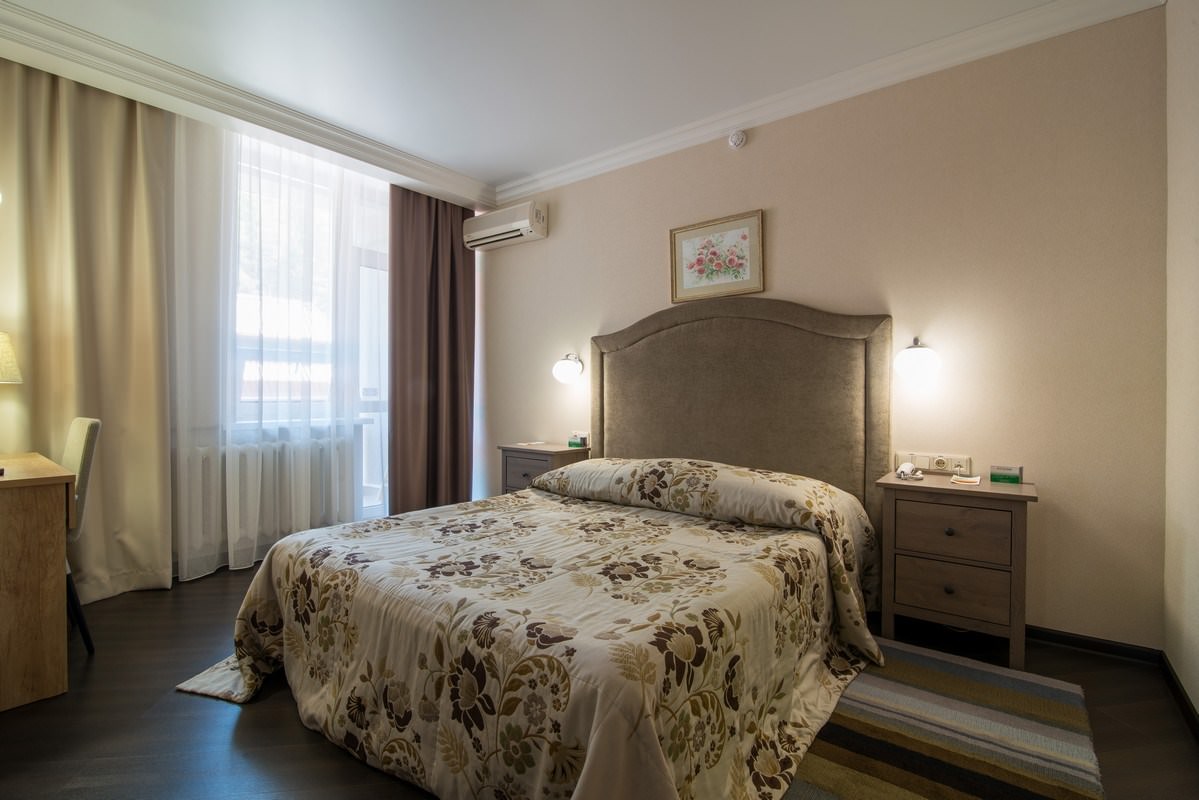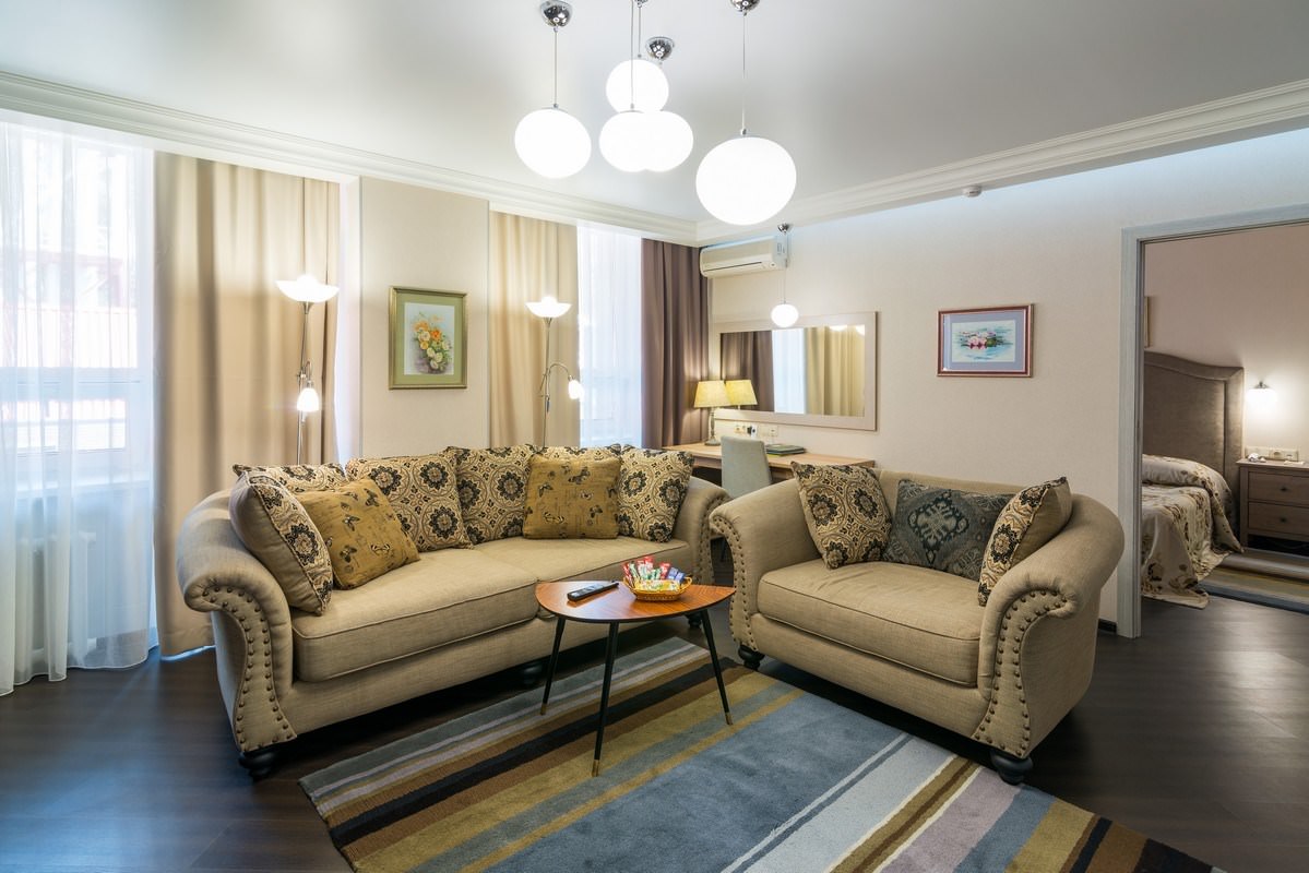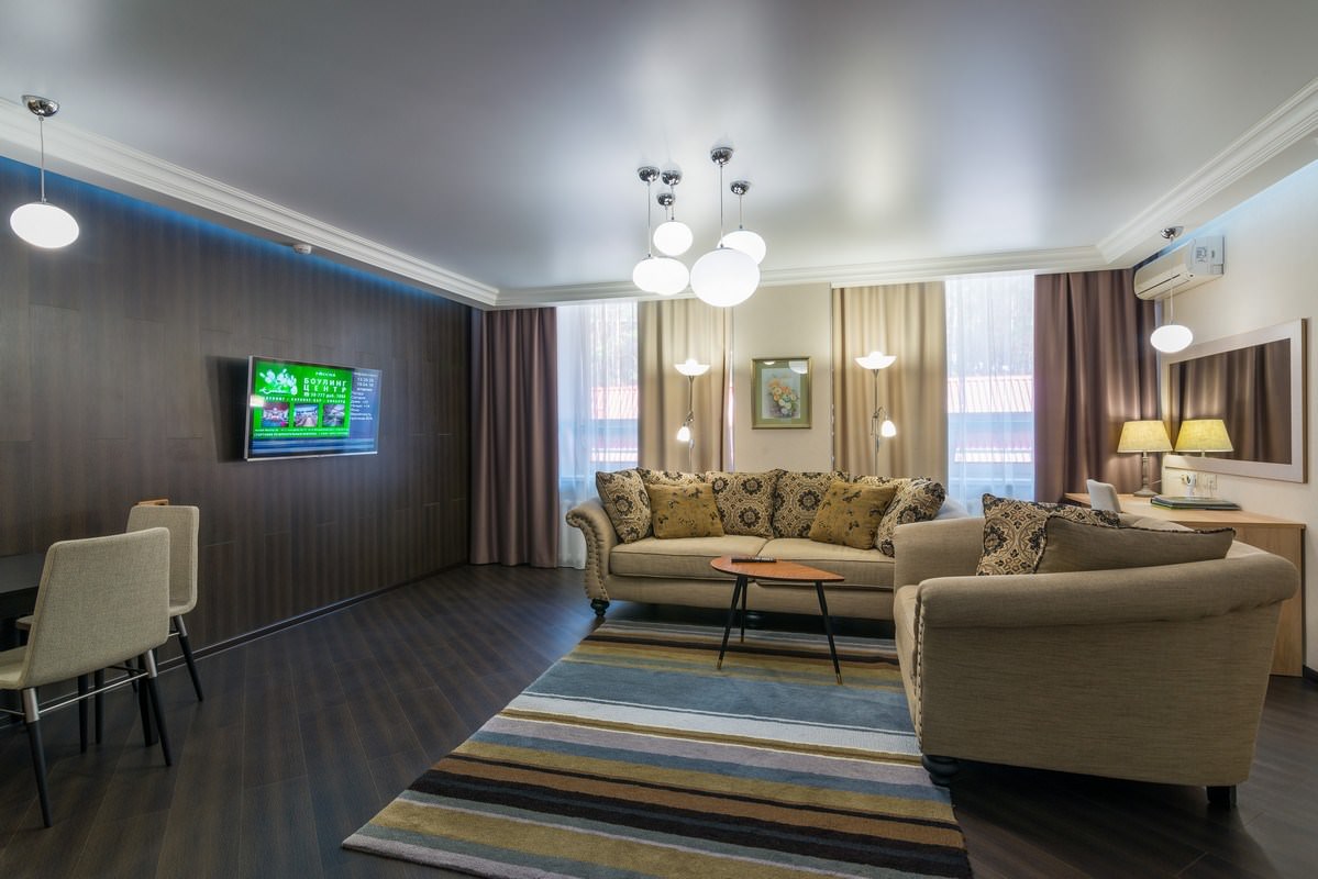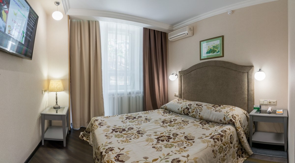Трехкомнатный номер площадью 93 кв.м., состоящий из двух спален, просторной гостиной с кухонной зоной, комнаты отдыха, двух ванных комнат и гостевого санузла. В номере возможно комфортное размещение как одного-двух гостей, так и большой семьи. В санатории «Россия» дети до 4-х лет размещаются в номере бесплатно без предоставления дополнительного места. При желании для комфортного сна малыша в номере устанавливается детская кроватка (данная услуга бесплатна). Стоимость детского питания (для детей до 4-х лет) составляет 360 рублей в сутки.
