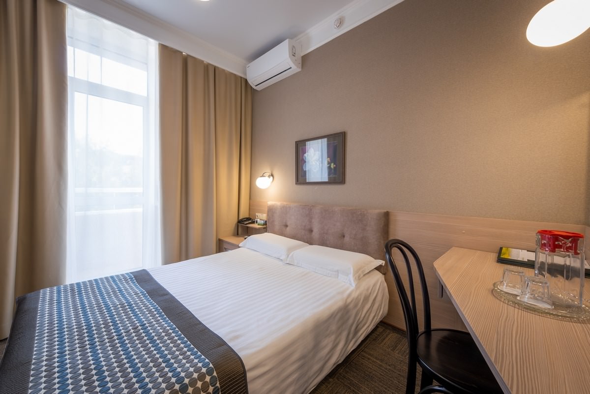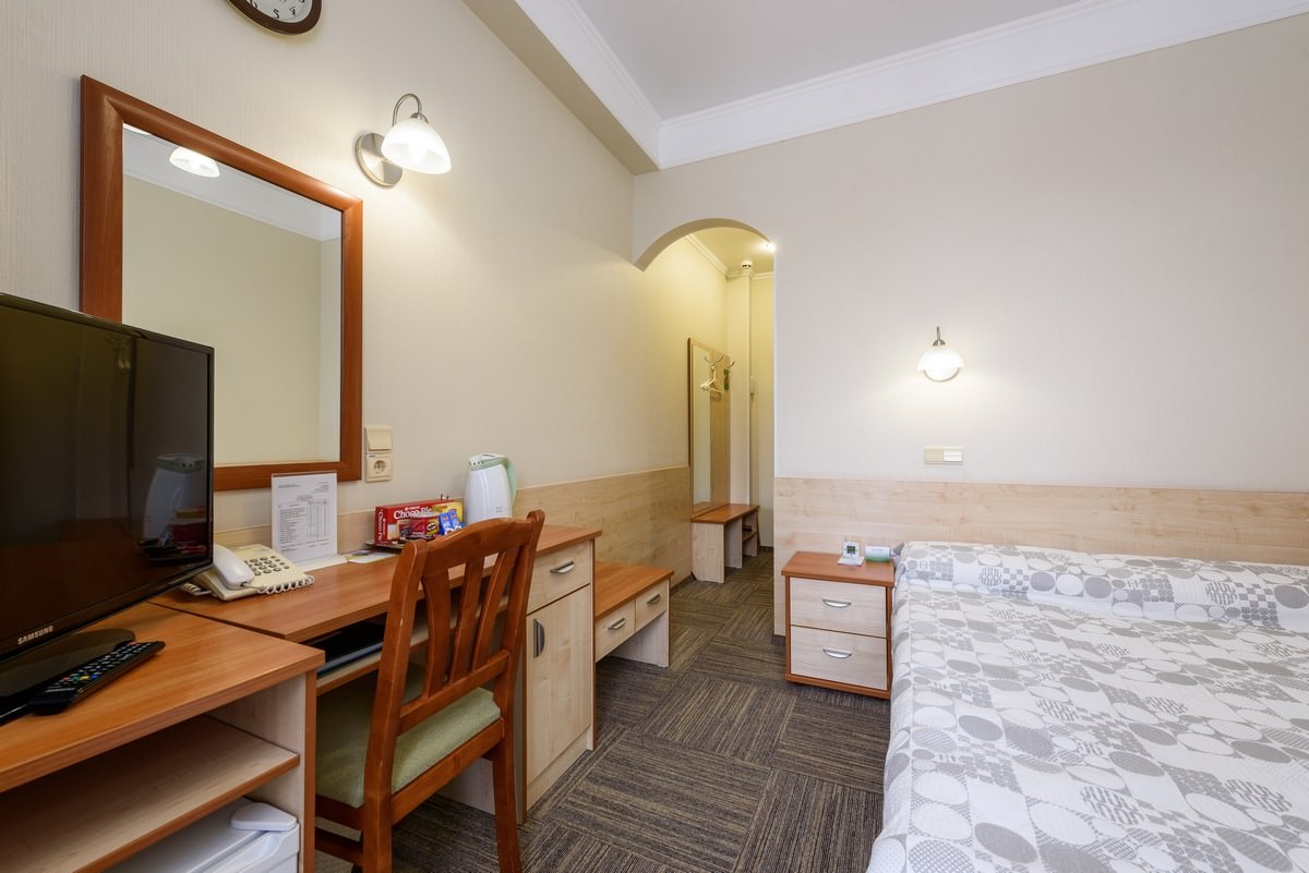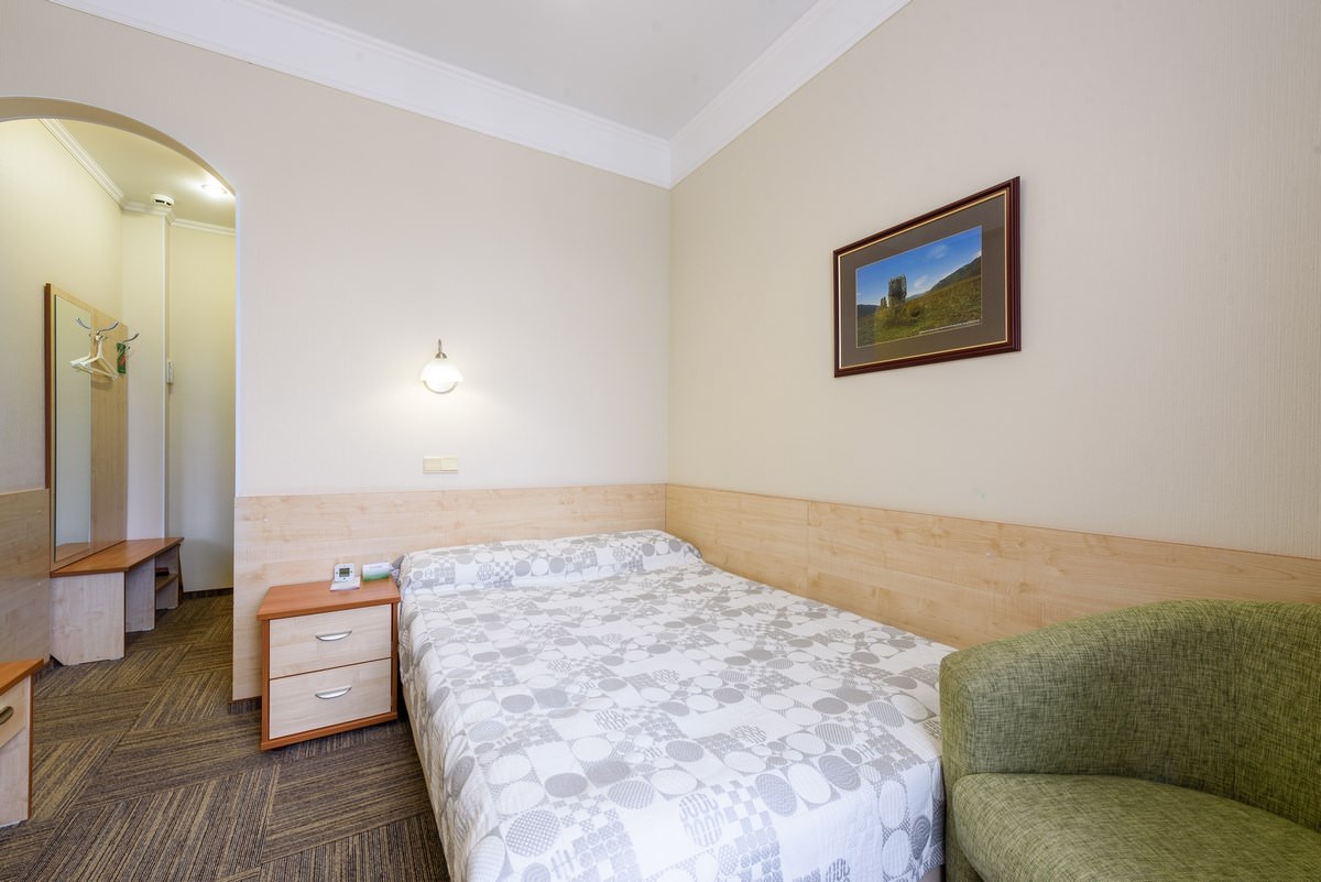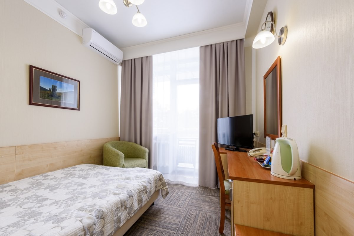 Уютный одноместный номер площадью 14 квадратных метров. В номере возможно комфортное размещение одного гостя. Дополнительное размещение взрослого или ребенка. В санатории «Россия» дети до 4-х лет размещаются в номере бесплатно без предоставления дополнительного места. При желании для комфортного сна малыша в номере устанавливается детская кроватка (данная услуга бесплатна). Стоимость детского питания (для детей до 4-х лет) составляет 360 рублей в сутки.